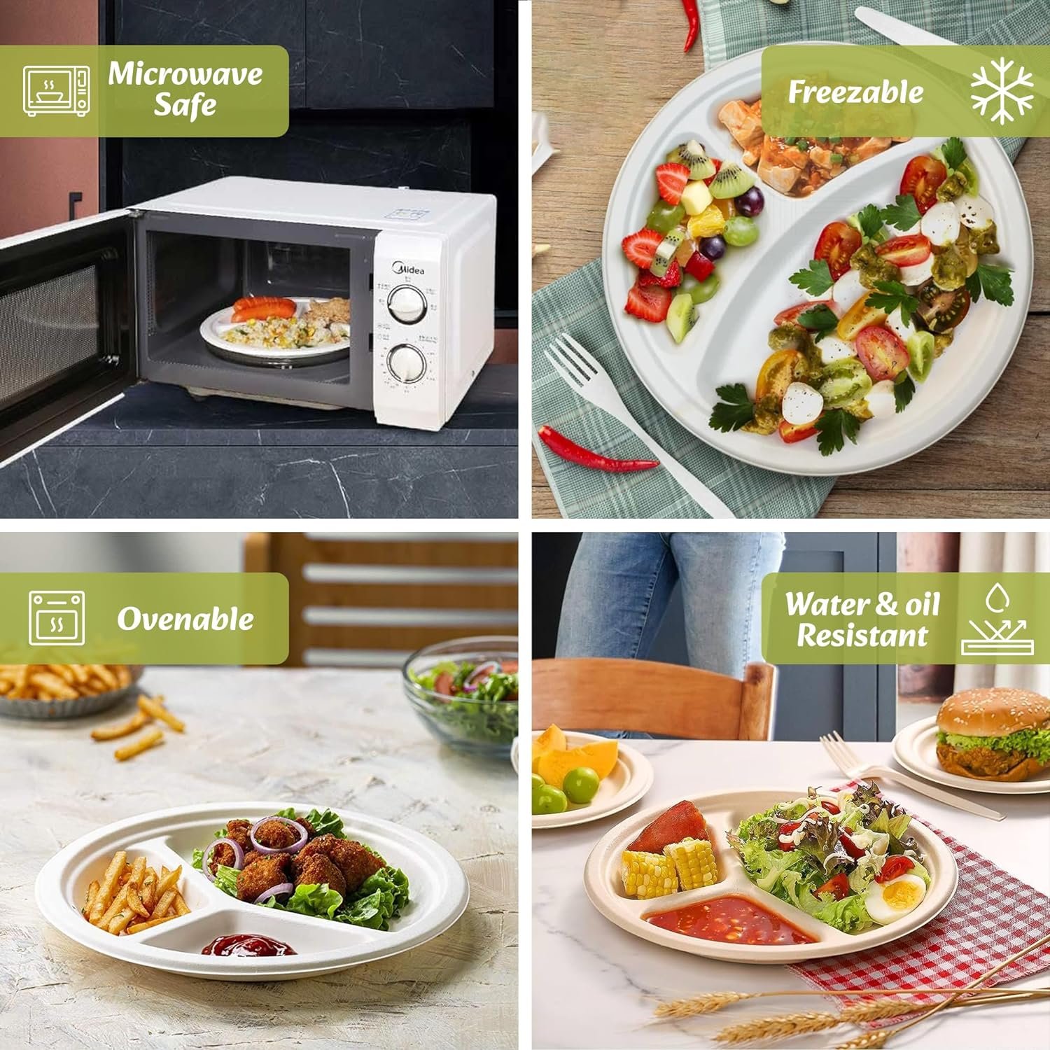 - Microwave and Freezer Safe 4 Compartment Super Rigid Paper Plates : Enjoy the convenience of using these plates for both hot and cold foods. They are microwave and freezer safe, providing versatility for various food options.