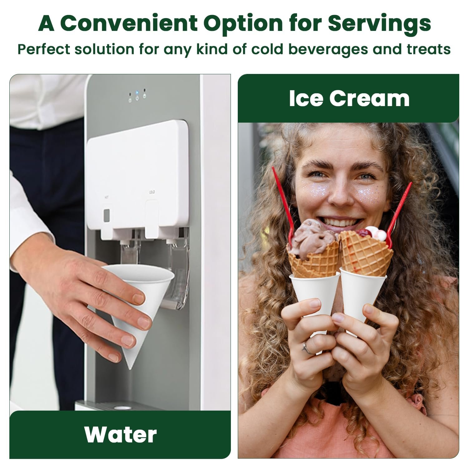 - UNIQUE DESIGN : disposable paper cone cups have a pointed bottom and cannot stand on their own; They can keep hygiene around the dispenser; The tight sealed seams of the cone cups ensure leak proof performance the cone shape is ideal for easy handling and sipping, making them perfect for parties, events, and office use.