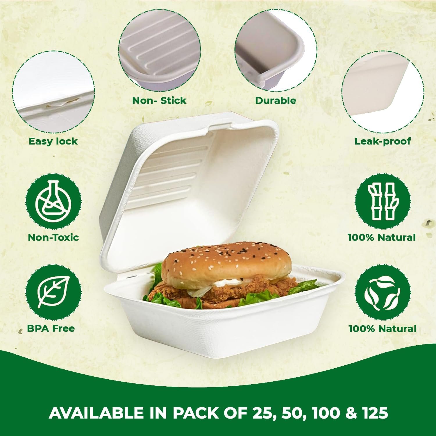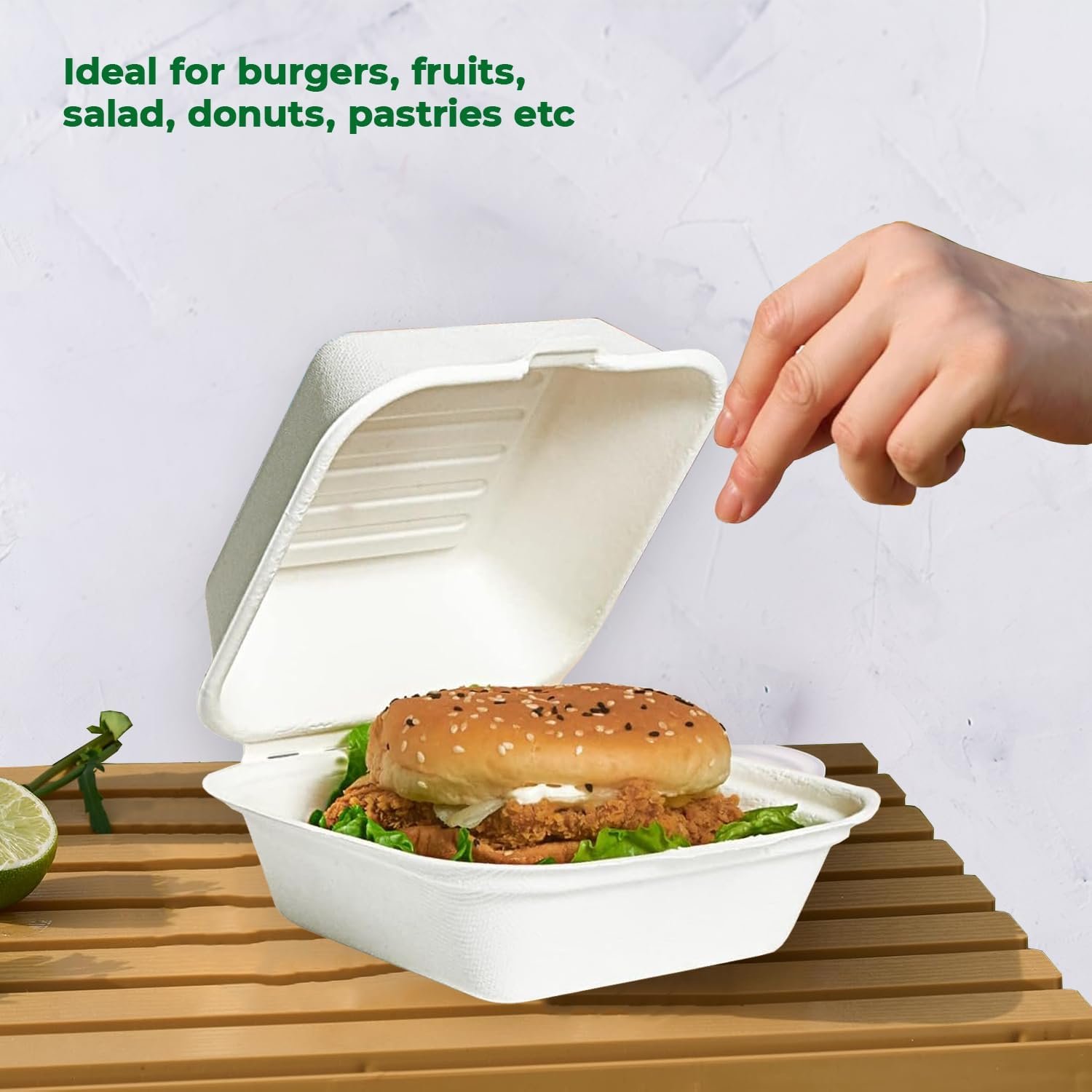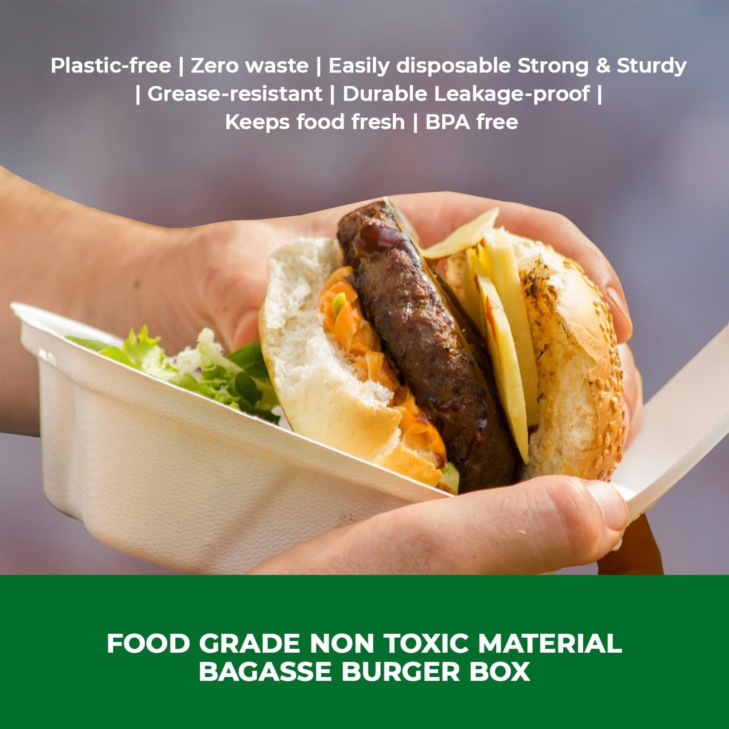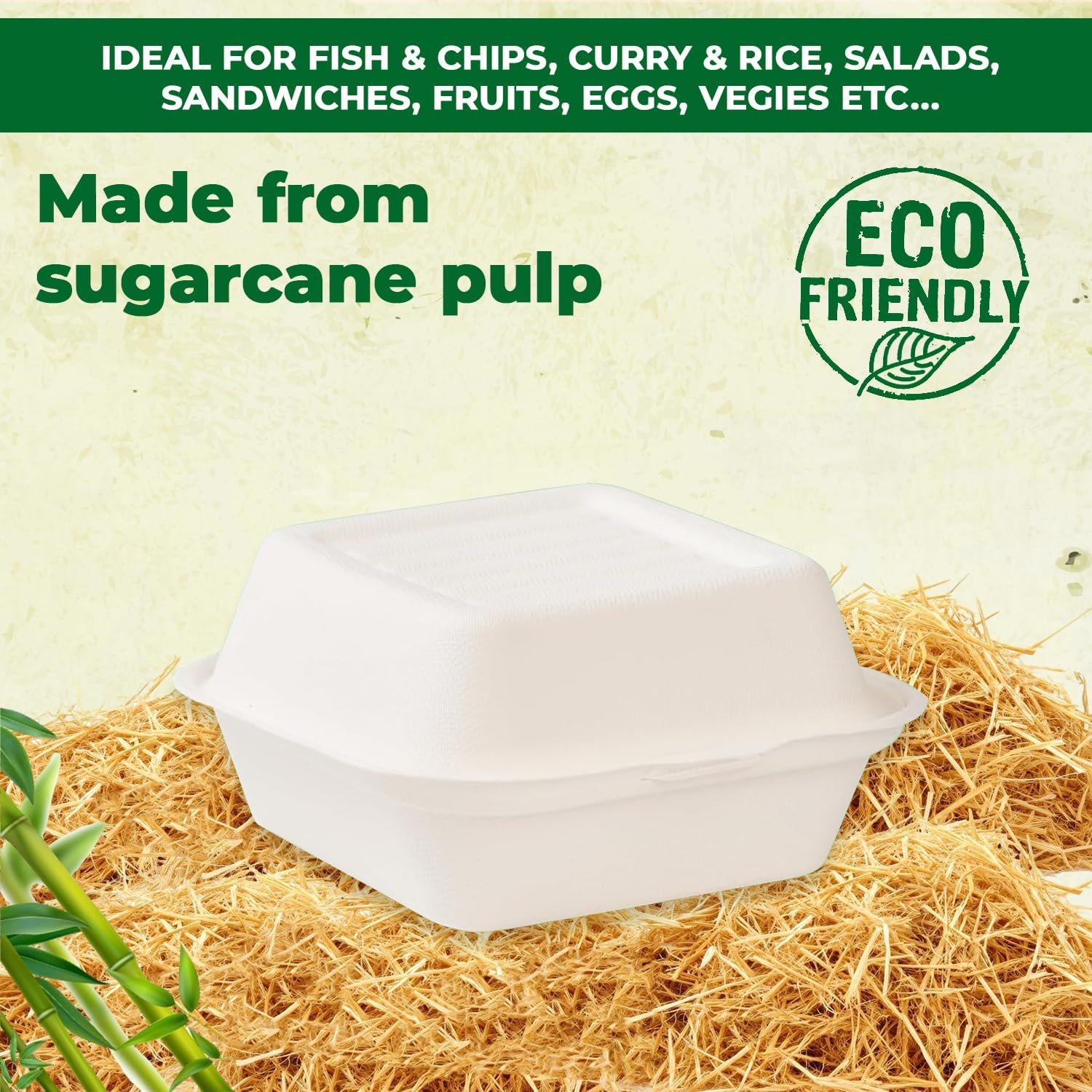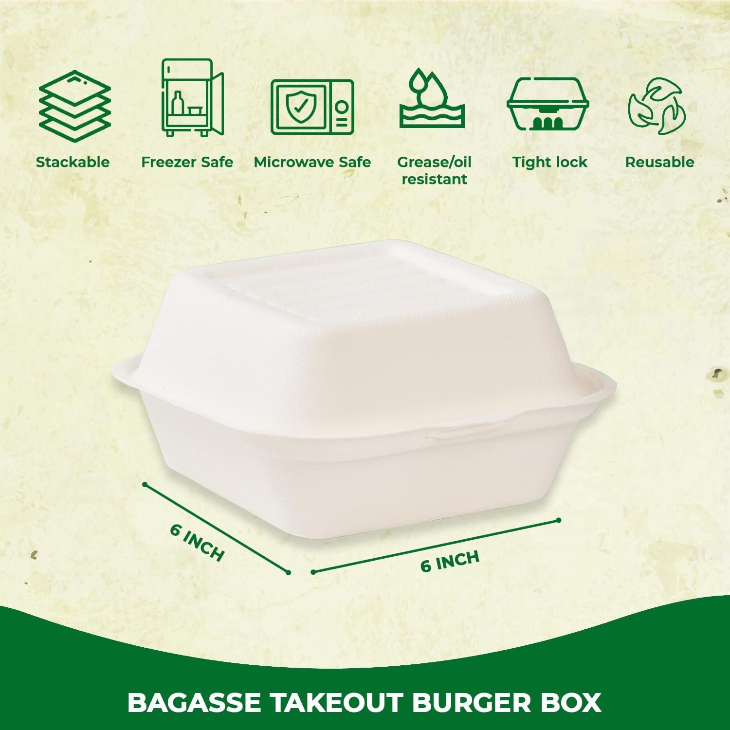 - BAGASSE TAKEAWAY BURGER BOXES : Our bagasse food boxes are ideal for restaurants, takeaways, schools, parties & more! measures 6 inches, providing enough space for burgers. these takeaway boxes are suitable for any occasion, from BBQs to corporate events. Their durable design is suitable for all gatherings, making them perfect for parties, birthdays, picnics, or anniversaries.
