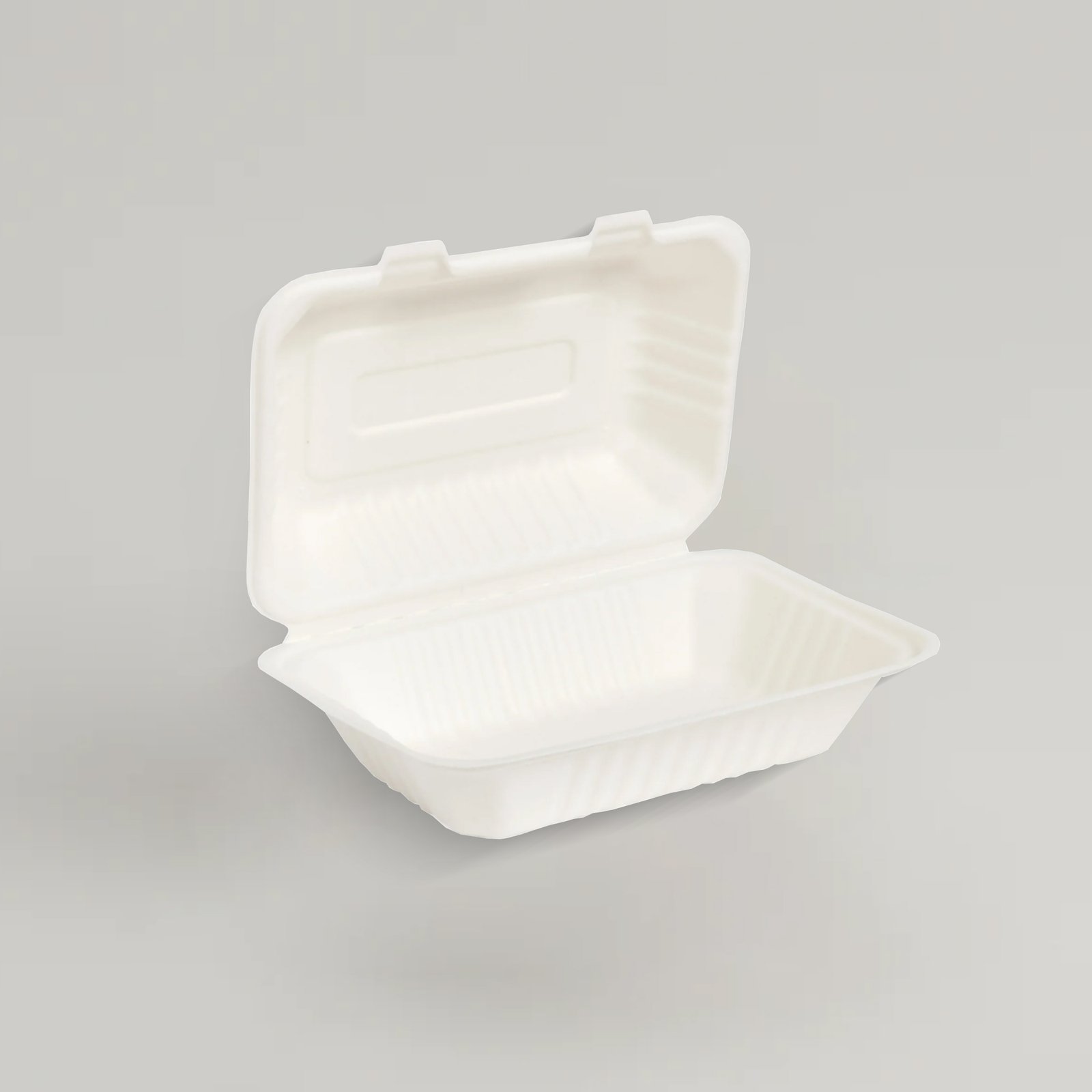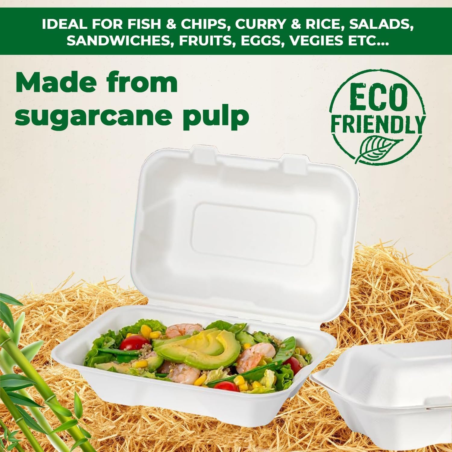 - 1 COMPARTMENT CLAMSHELL TAKEAWAY BOXES 9×6 INCH : Our Clamshell Bagasse Burger Boxes are crafted from sustainable and biodegradable materials, making them an eco-conscious choice for your foodservice needs. Takeaway boxes are perfect for cafes and restaurants serving takeaway food. They can also be used as takeaway containers for leftovers at house parties, barbecues, weddings and other events.