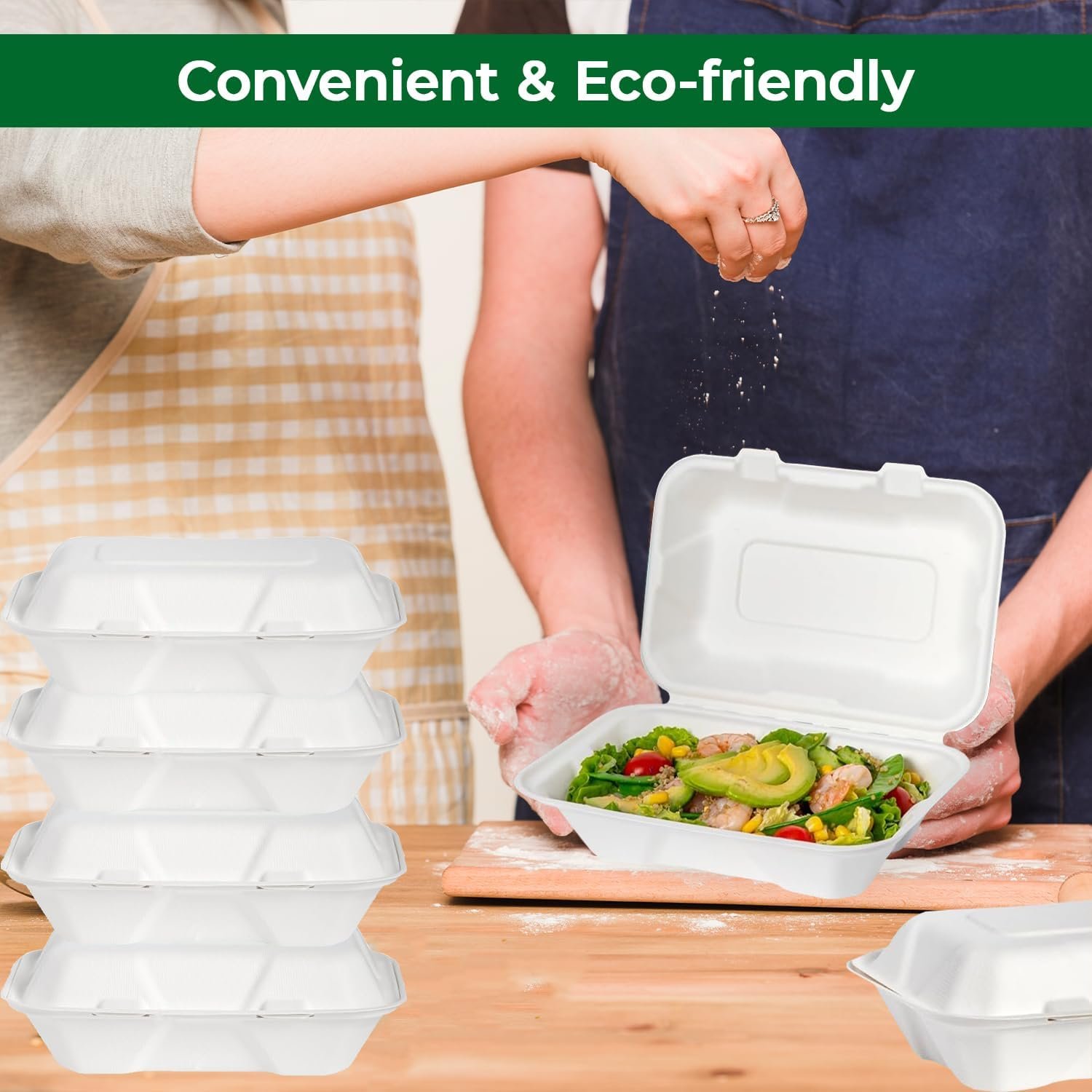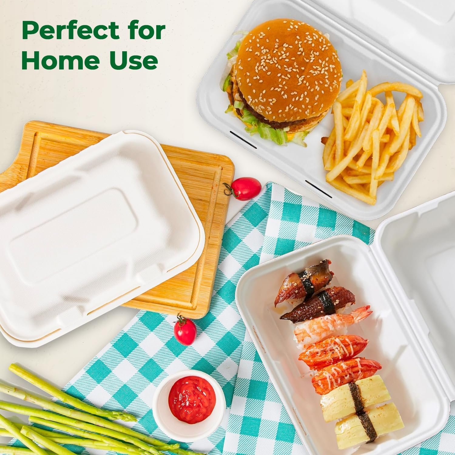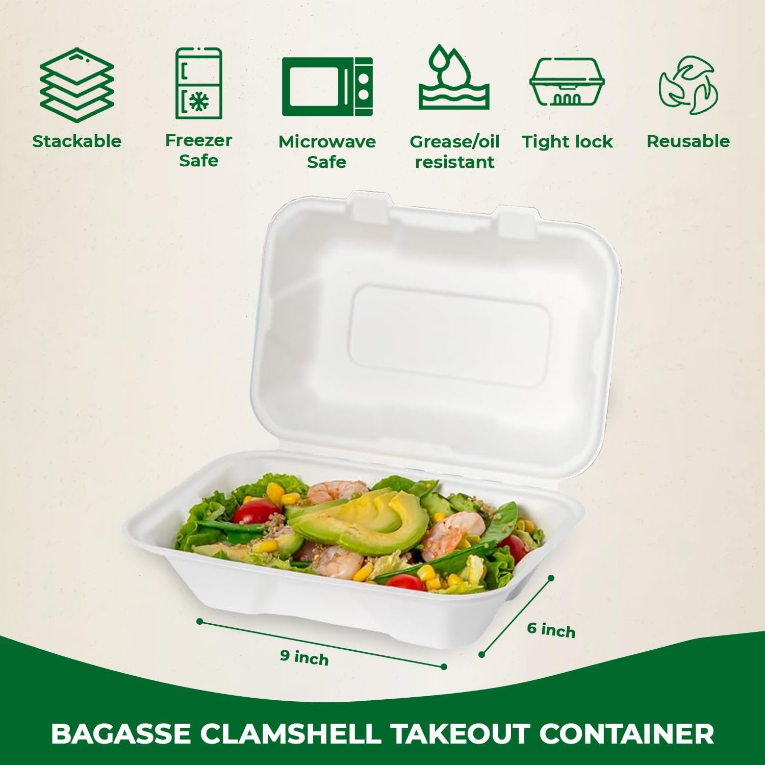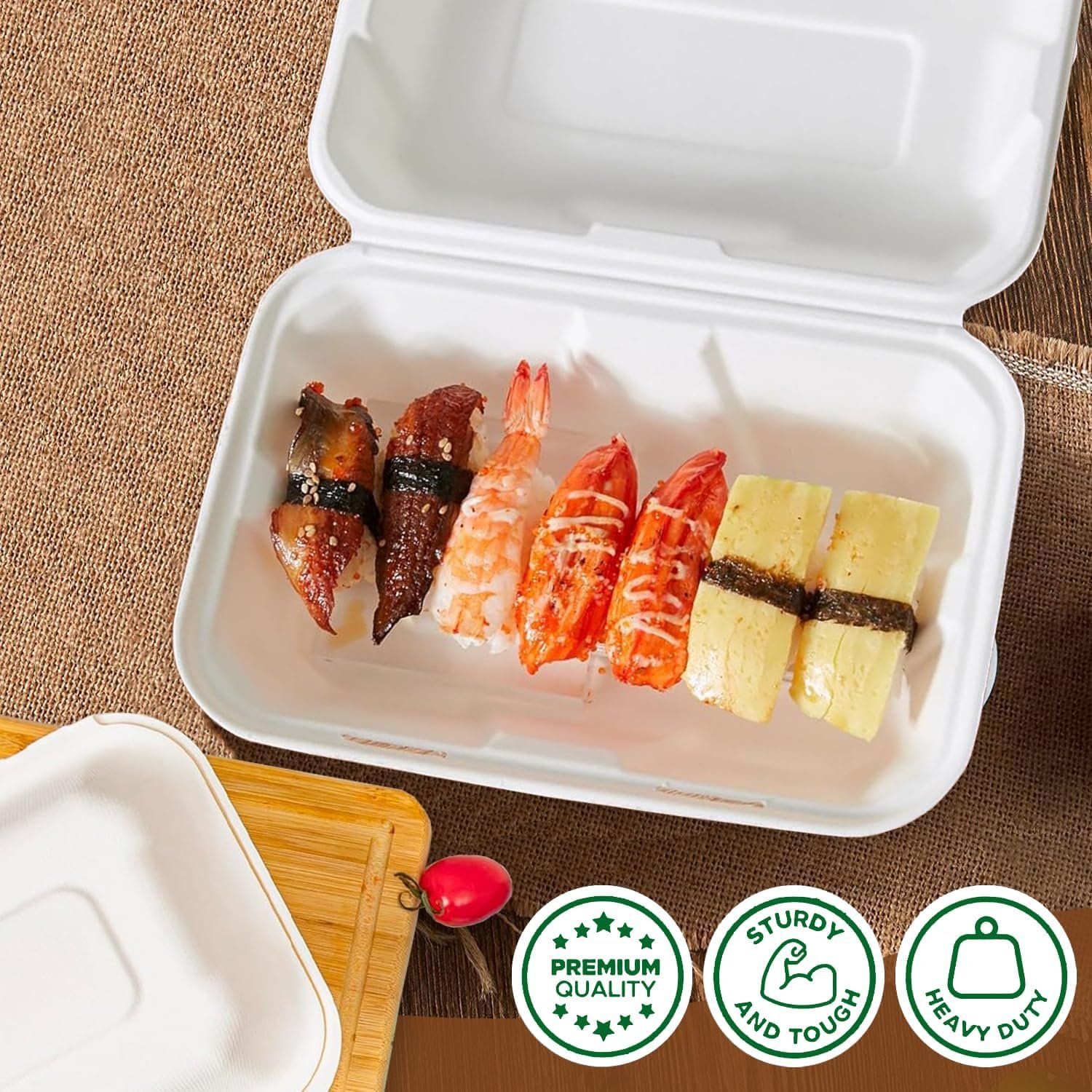 - PREMIUM QUALITY AND STURDY : Our strong sugarcane bagasse clamshells do not bend or collapse under weight and you can hold your food confidently with one hand. Suitable for any type of food – hot, cold, dry, wet, sticky, sweet, spicy – you name it!