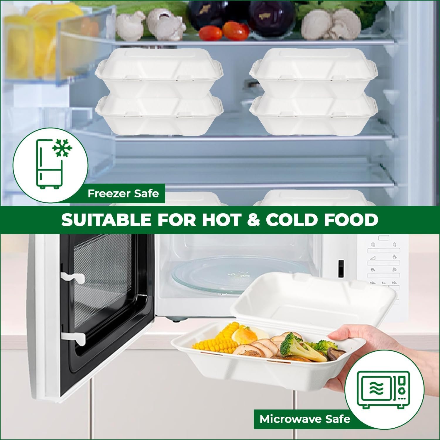 - MICROWAVE AND FREEZER SAFE : These compostable take out containers can be used for hot or cold food items. It offers reliable strength and does not contain any plastic or wax lining. Microwave and Freezer Safe. Our food containers to go are easy to stack, helping you save on storage space.