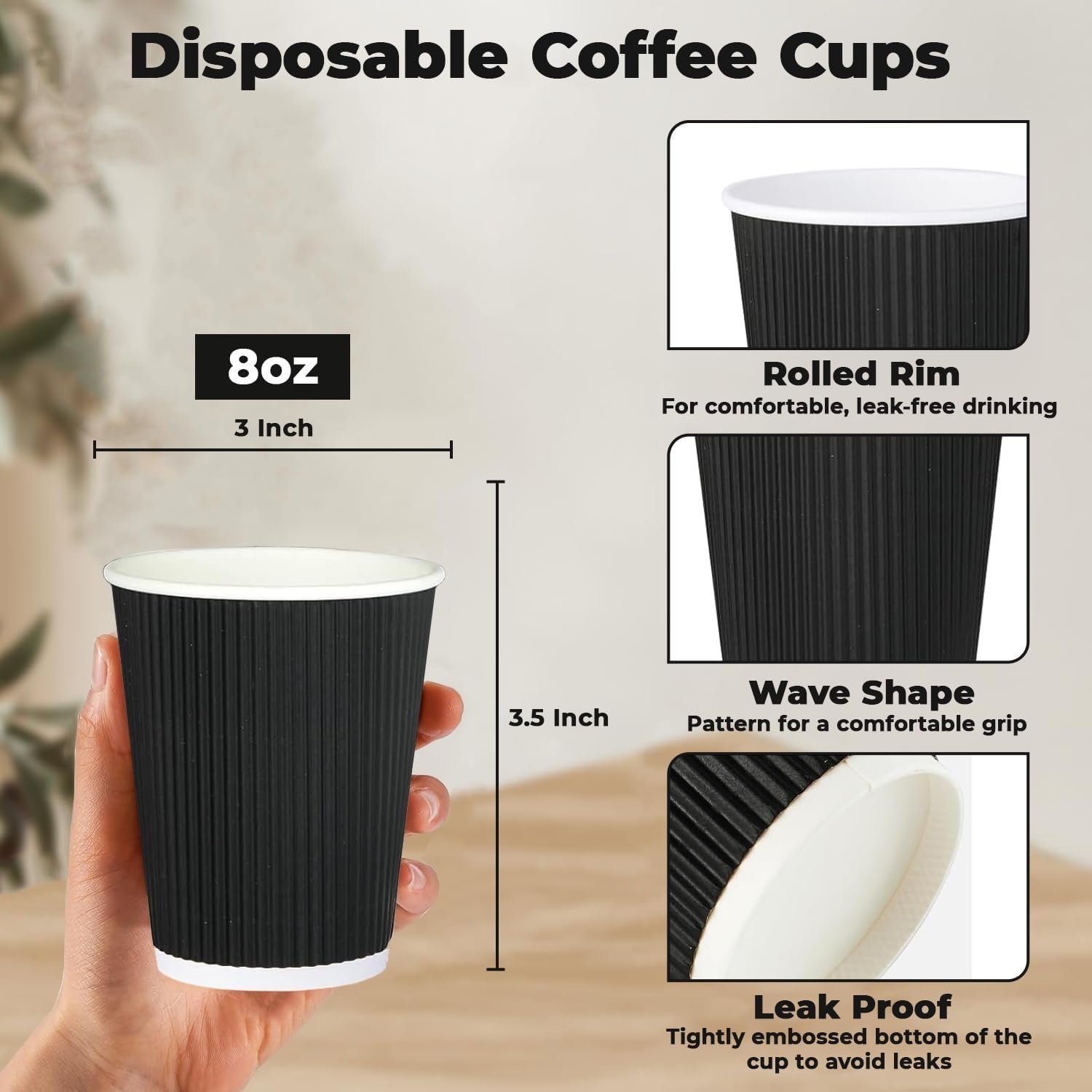 - BLACK PAPER CUPS FOR HOT DRINKS : Takeaway coffee cups disposable coffee cups for hot drinks Enjoy your hot beverages longer with our innovative triple-wall design that keeps drinks warmer while ensuring a cool, comfortable grip. 8oz / 12oz / 16oz Triple-layered ripple cup designs are perfect for your coffee and tea serving needs, which give a convenient grip for a hot drink on the go.