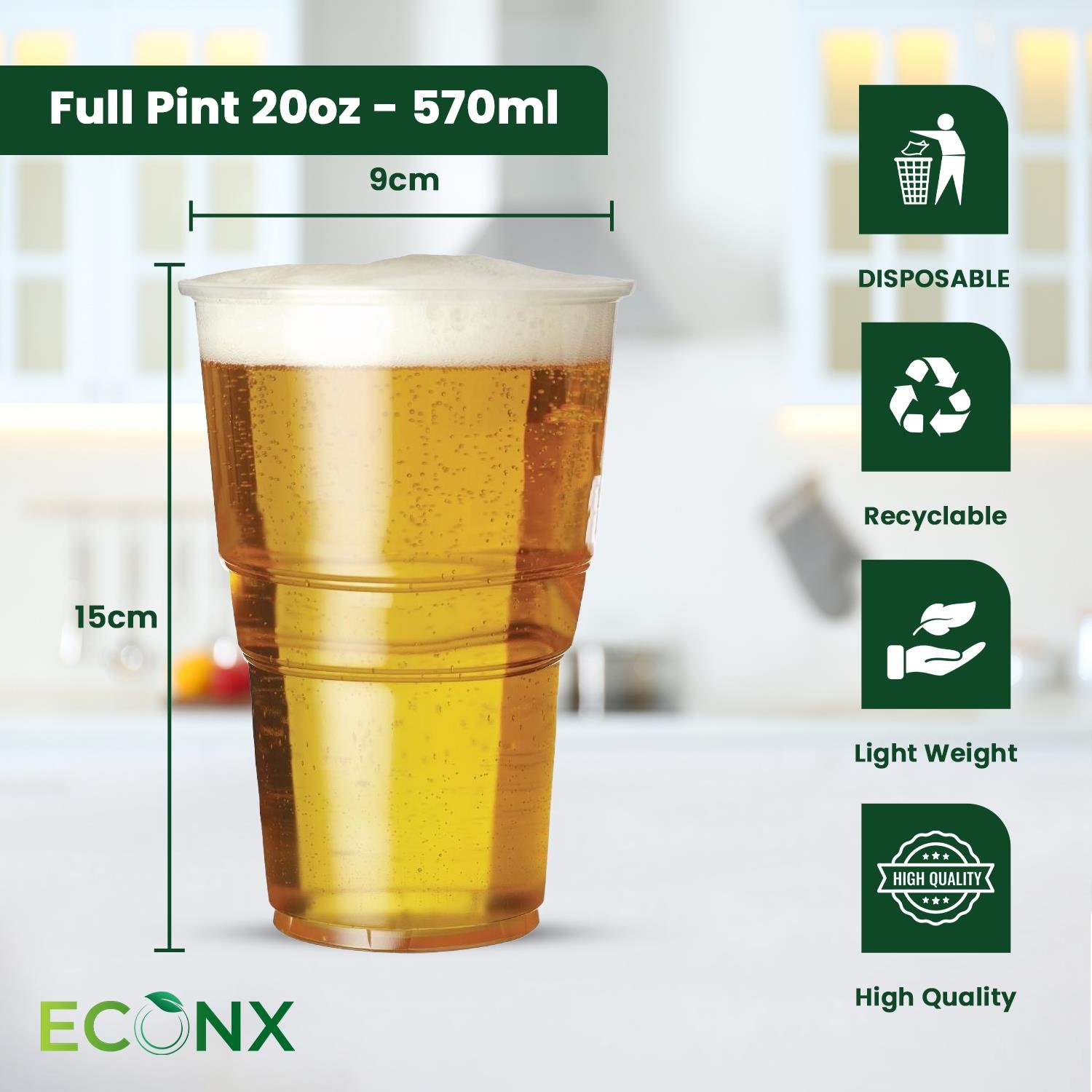 - REUSABLE DRINKING CUPS : These high-quality disposable cups are BPA-FREE. You can also reuse the ECONX plastic pint glasses after washing. ECONX is an established supplier to the food industry across the UK. All sorts of beer or any other type of drink like ice cold juice.