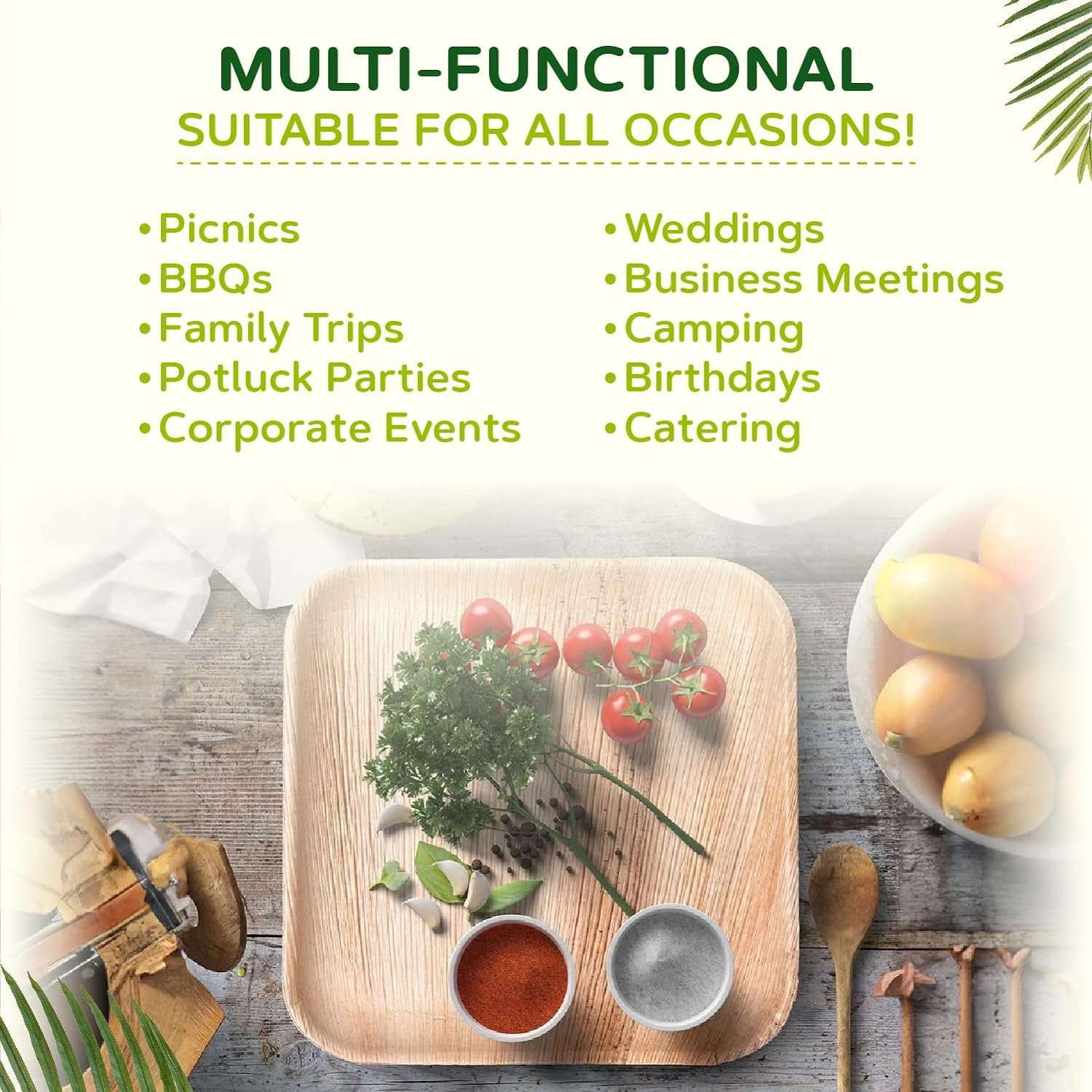 Eco-friendly disposable plates ideal for birthday parties, weddings, camping, BBQ, picnics, garden parties, corporate and catering events.